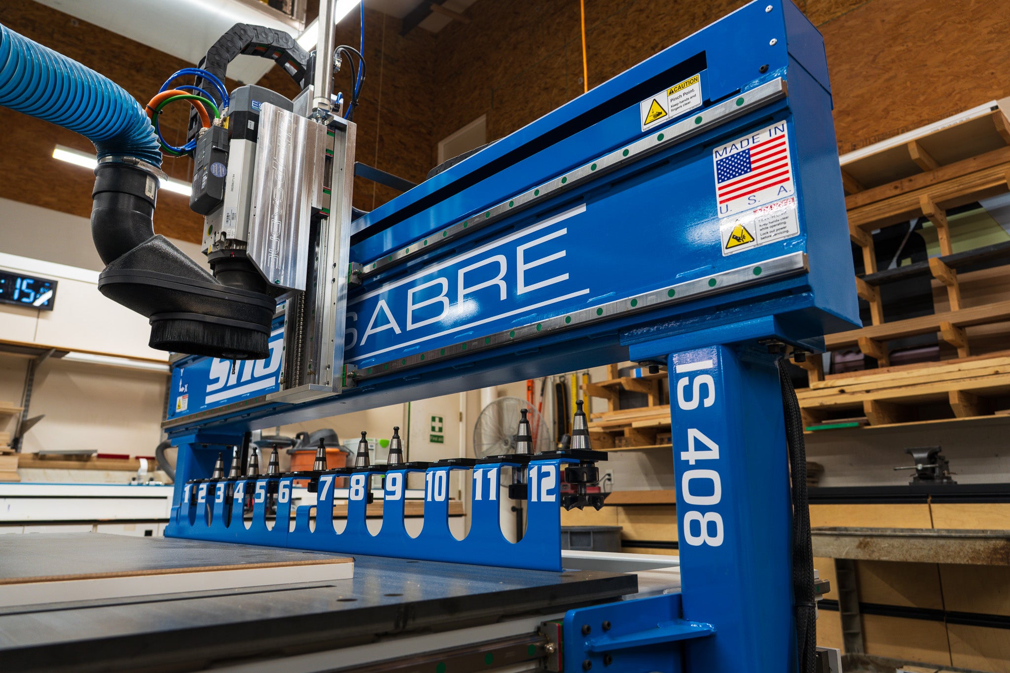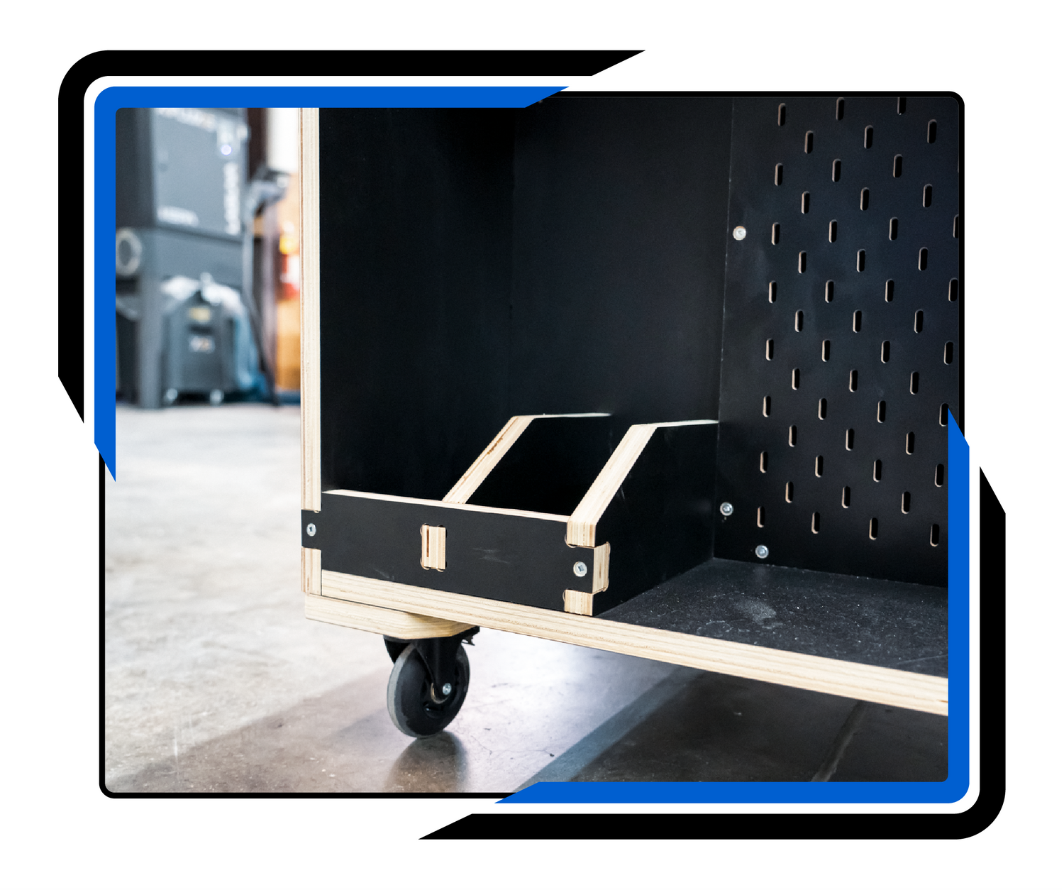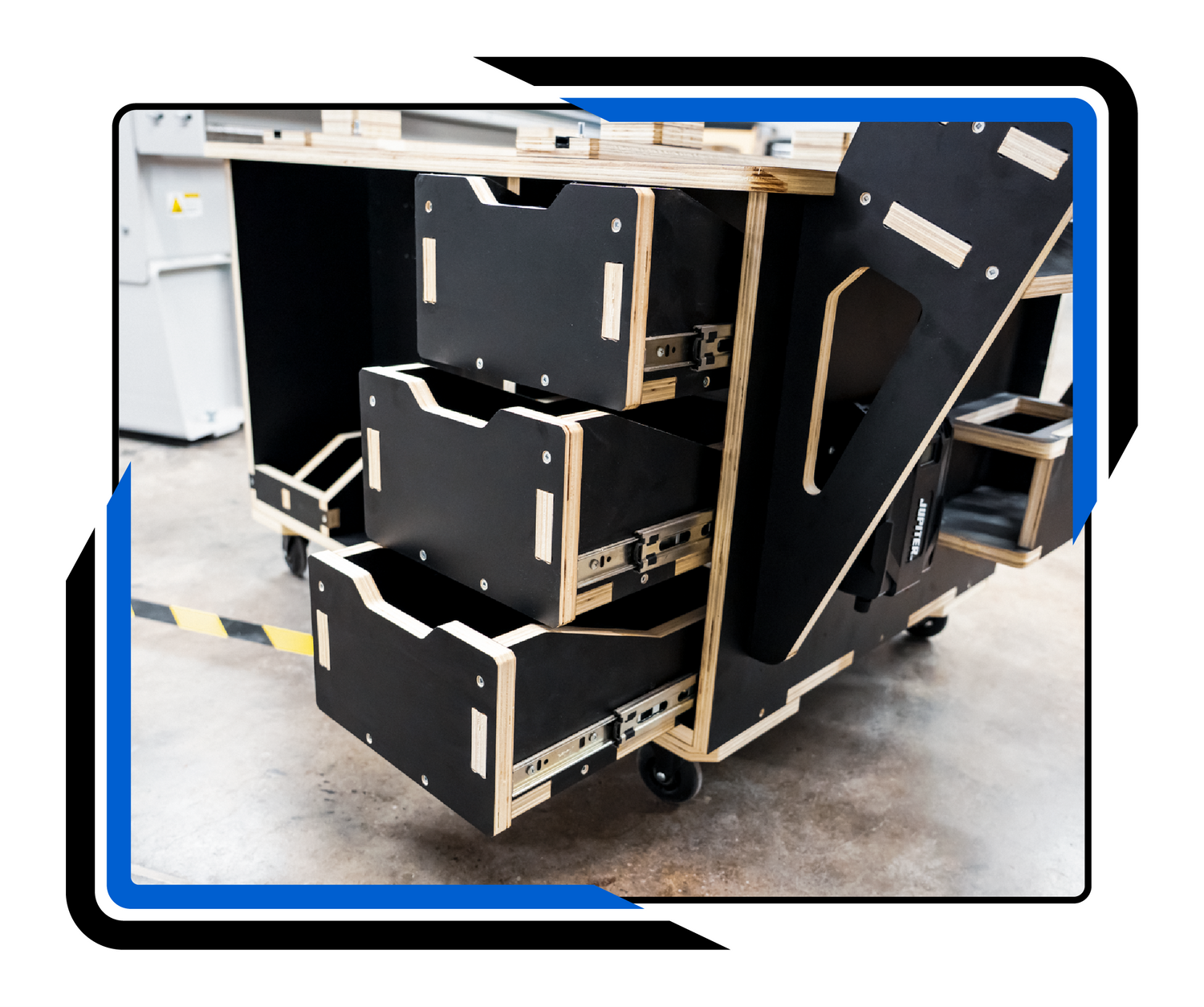 Built-in drawer storage keeps tools, hardware, and parts organized and immediately accessible in the pit.
